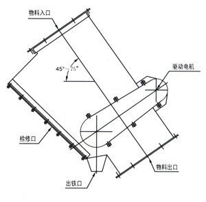 由管道體、驅(qū)動(dòng)裝置、磁體運(yùn)行裝置三大部分組成,驅(qū)動(dòng)裝置安裝在管道壁上,通過(guò)鏈輪、鏈條帶動(dòng)管道體內(nèi)磁分離腔的磁體運(yùn)行裝置運(yùn)轉(zhuǎn),永磁體將管道內(nèi)物料中混雜的鐵磁性物質(zhì)通過(guò)出鐵口排出管道外。